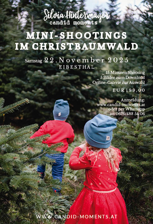 Für alle, die heuer unterm Christbaum die Augen ihrer Liebsten mit persönlichen Bildern zum Glänzen bringen wollen: Auch heuer biete ich wieder diese wunderbar weihnachtliche Shooting-Aktion im zauberhaften Christbaumwald.